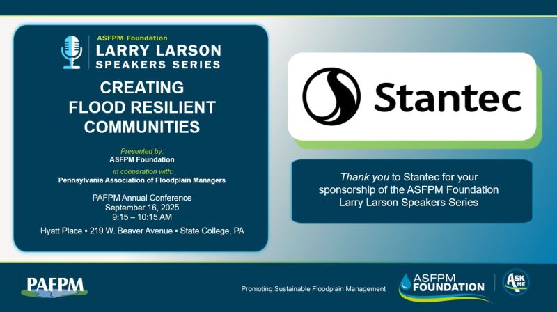 Thank you to Stantec for your sponsorship of the Larry Larson Speakers Series (LLSS) event, which is being hosted by the ASFPM Foundation in cooperation with the Pennsylvania Association of Floodplain Managers at the PAFPM Annual Conference in State College, PA.